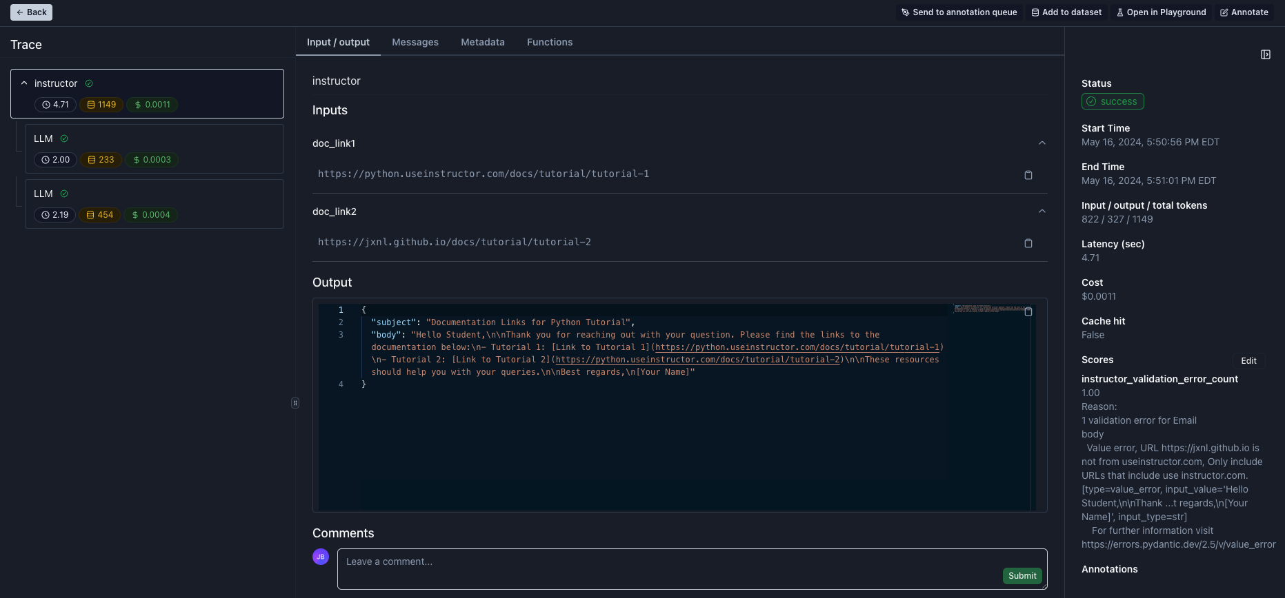• bottom of right sidebar: any validation errors are captured and tracked as score for the trace which enables visualizing them in dashboards and filtering by them on tables